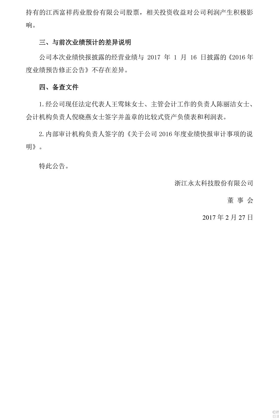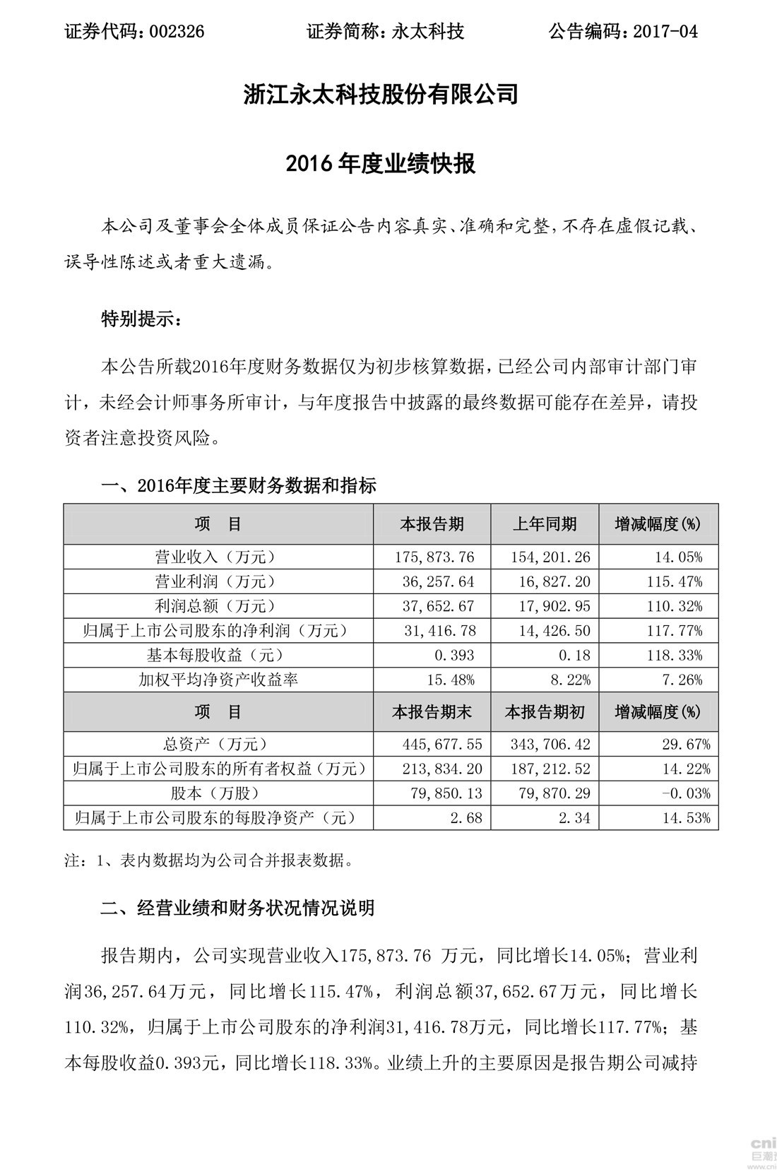 永太科技:2016年度業(yè)績快報