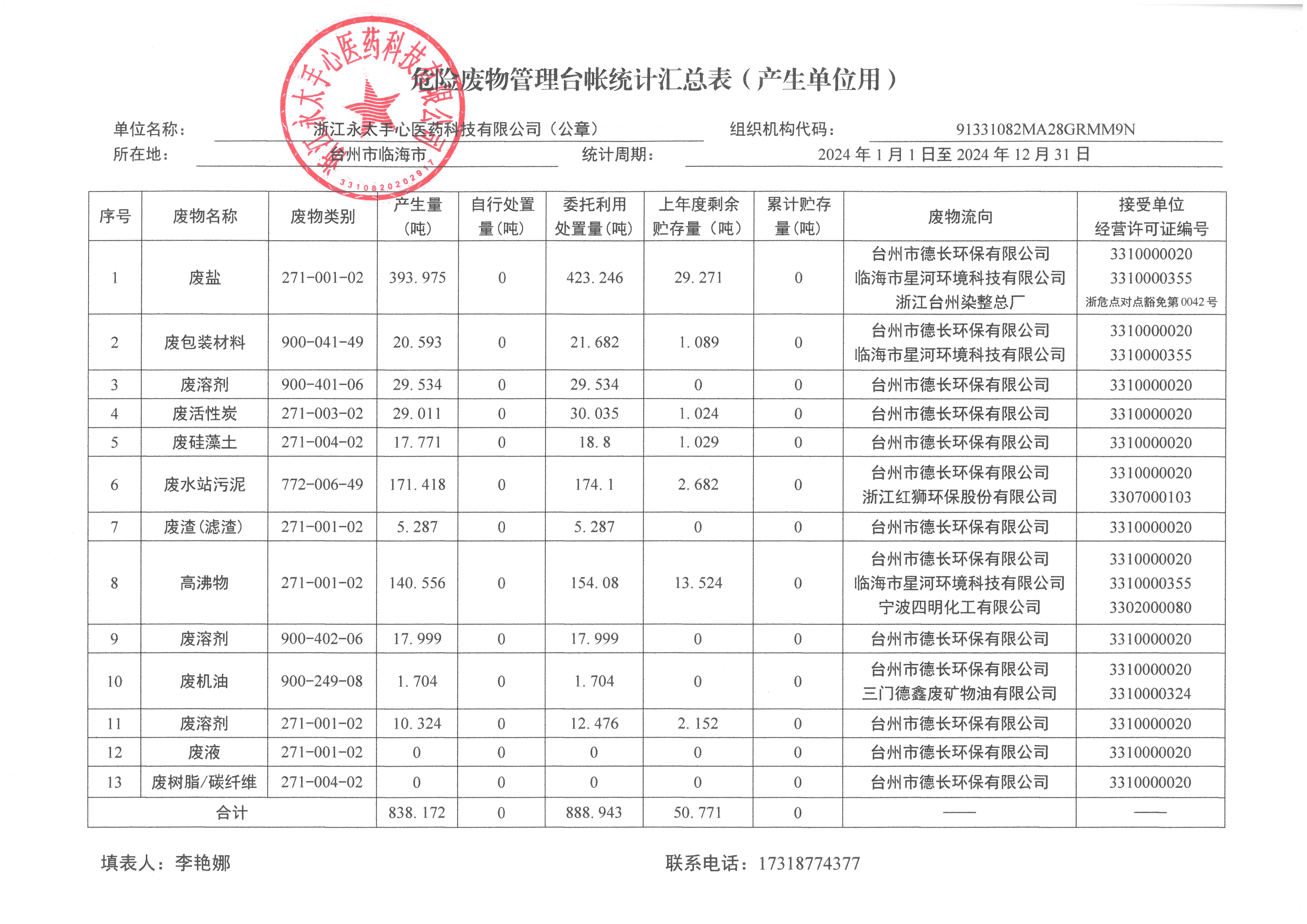 永太手心2024年危險廢物管理臺帳統(tǒng)計匯總表