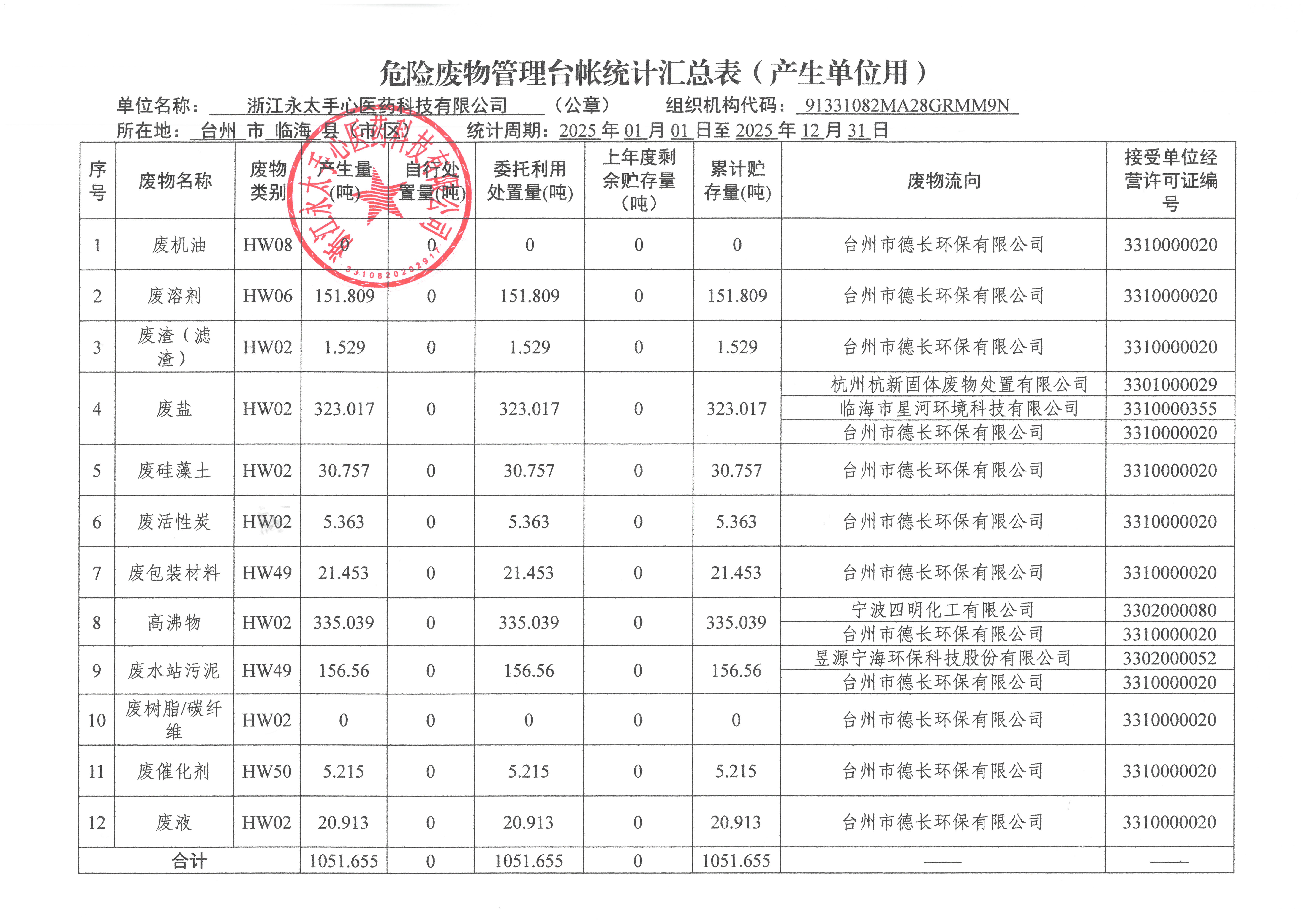 永太手心2025年危險(xiǎn)廢物管理臺(tái)帳統(tǒng)計(jì)匯總表