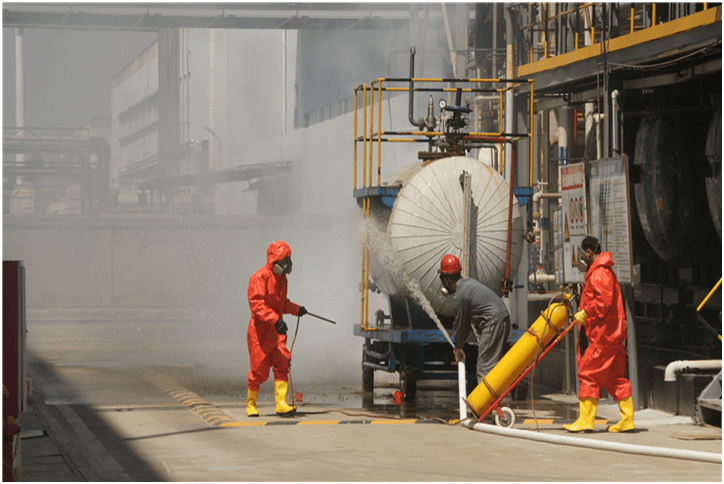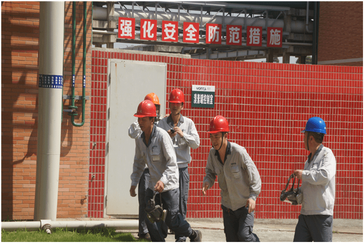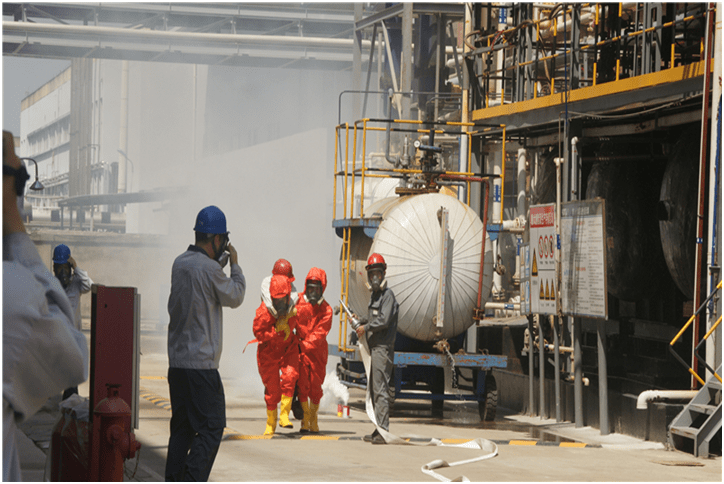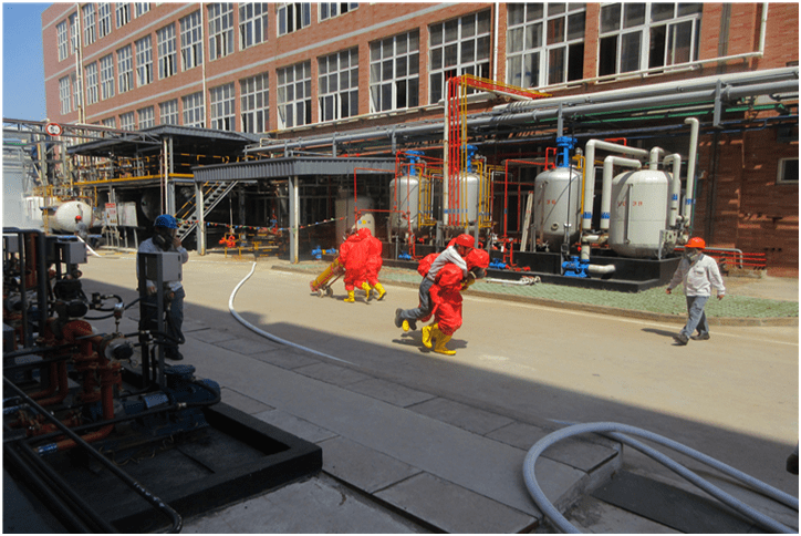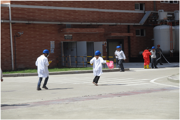 上午9:30,EHS總監(jiān)王梓臣向204演練人員牛群發(fā)布演練命令,演練開始。牛群打開發(fā)煙罐模擬溴素泄漏暈倒在現(xiàn)場(chǎng),隨行的潘和平馬上撤離并向204車間主任周烈軍報(bào)告;